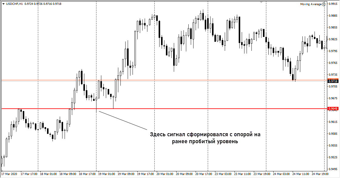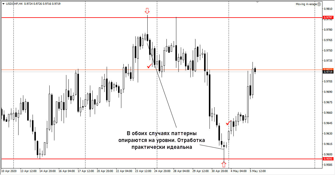 Мы не торгуем непосредственно после формирования паттерна, нужно дождаться развития движения, получить откат и только после этого заключается сделка: