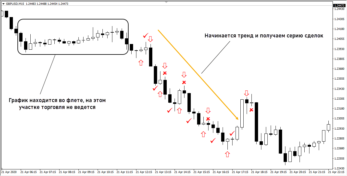 Свечной анализ дает неплохие точки входа, но трейдер оказывается зависим от конфигурации свечей. Если тот же пин бар не будет соответствовать правилам, осторожный трейдер проигнорирует его и может упустить прибыльную точку входа.