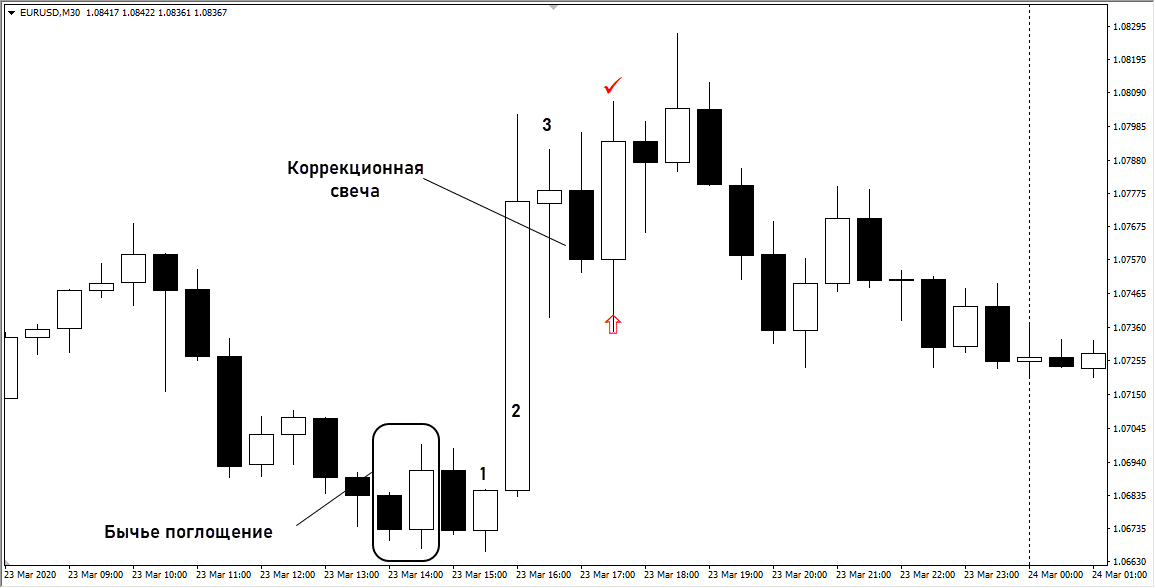 - после поглощения должно сформироваться подряд 3 свечи соответствующего цвета. Например, при бычьем развороте нужно, чтобы появилось 3 последовательно повышающиеся белые свечи (ориентироваться нужно по цене закрытия);