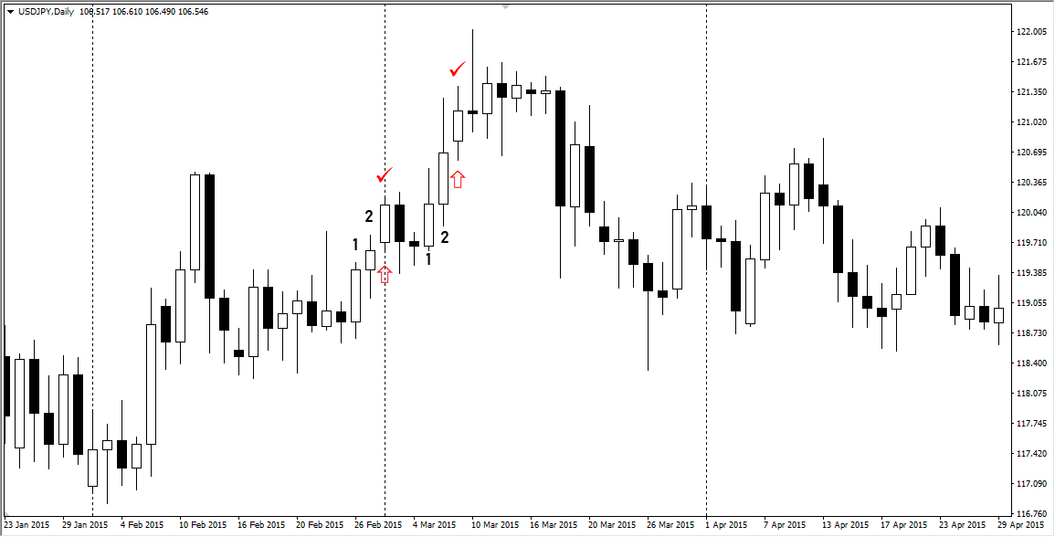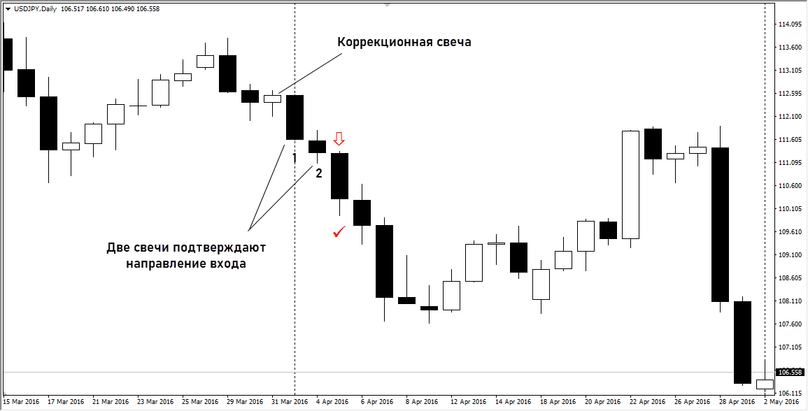 - после коррекционной свечи формируется 2 трендовые свечи. Первая крупная, подтверждающая возобновление тренда, вторая – несколько меньшего размера. Например, на растущем рынке формируется небольшая черная свеча, затем большая белая и следом за ней еще одна белая, но меньшего размера;