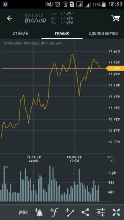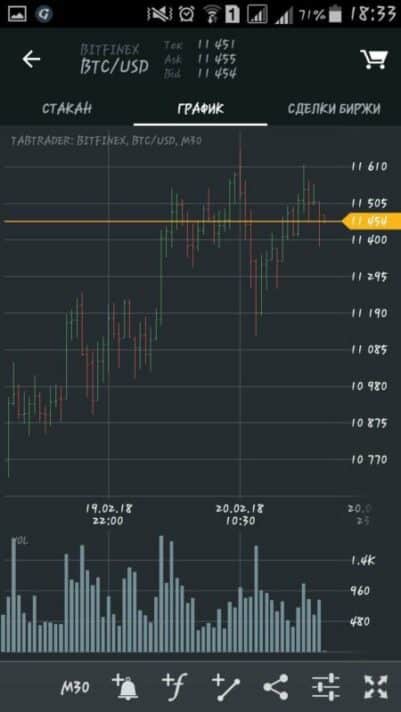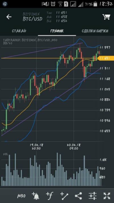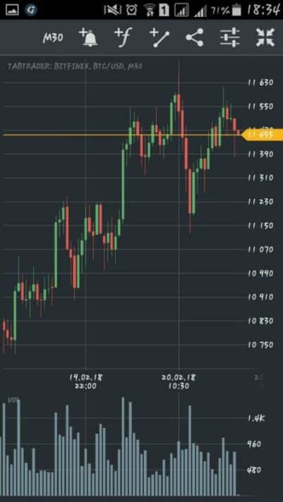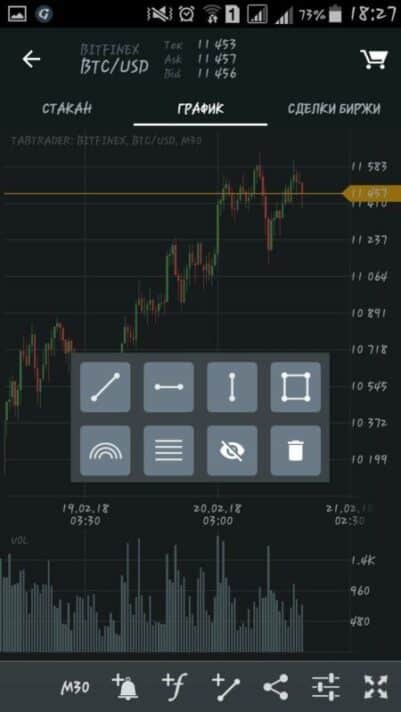 Можно провести необходимый Вам технический анализ графика, выставив различного рода индикаторы. Также можно начертить необходимые линии, и выбрать для них цвет. Вообщем, интерфейс и функциональность приложения Tabtrader практически ничем не уступает возможностям торгового терминала Meta Trader и криптовалютных бирж.