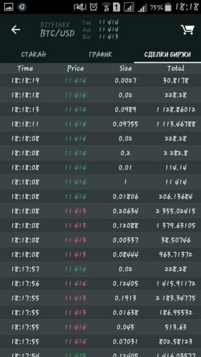 Нажмите на интересующую торговую пару пальцем и у Вас на экране откроется окно с подробным графиком, который Вы можете настроить по собственному усмотрению. Т.е. Вы можете выбрать, чтобы график отображался в виде линии, свечей либо баров. Также можно установить удобный для торговли временной интервал. Внизу отображаются объемы торгов, которые не мешают просмотру основного графика.