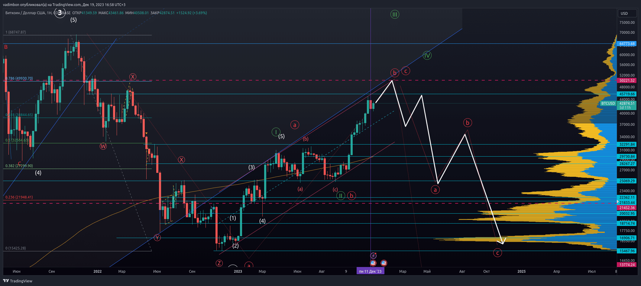 - Коррекция. Большая вероятность того, что текущий рост биткоина есть ни что иное как волна B коррекции ABC, которая имеет свое начала от максимума 2021 года. Волна B обычно состоит из такой же формации ABC, только направленной вверх. Проанализировав структуру текущего роста, можно предположить что мы уже получили волны A и B, и сейчас формируется С волна данной коррекции. Пока котировки находятся вне восходящего канала от 2015 года, этот сценарий остается наиболее вероятным. В этом случае, текущий рост не может превысить хай 2021 года, и после окончания этой C волны, последует большая С волна вниз, которая как минимум должна достигнуть предыдущего лоу в районе 15 тыс.