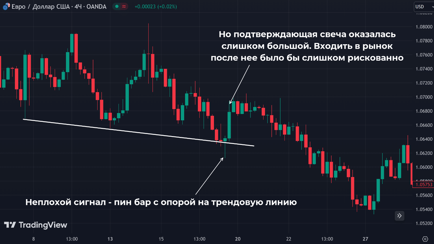 Если последняя свеча окажется слишком крупной, то формально все правила будут выполнены, но входить в рынок нет смысла. Слишком невыгодным будет Risk Reward.
