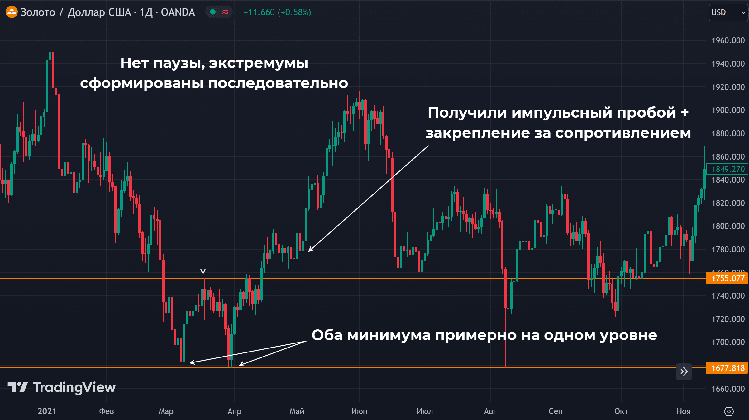 - Желательно, чтобы экстремумы формировались на плавных движениях. В идеале время формирования каждого Low примерно одно и то же (имеется в виду количество свечей).