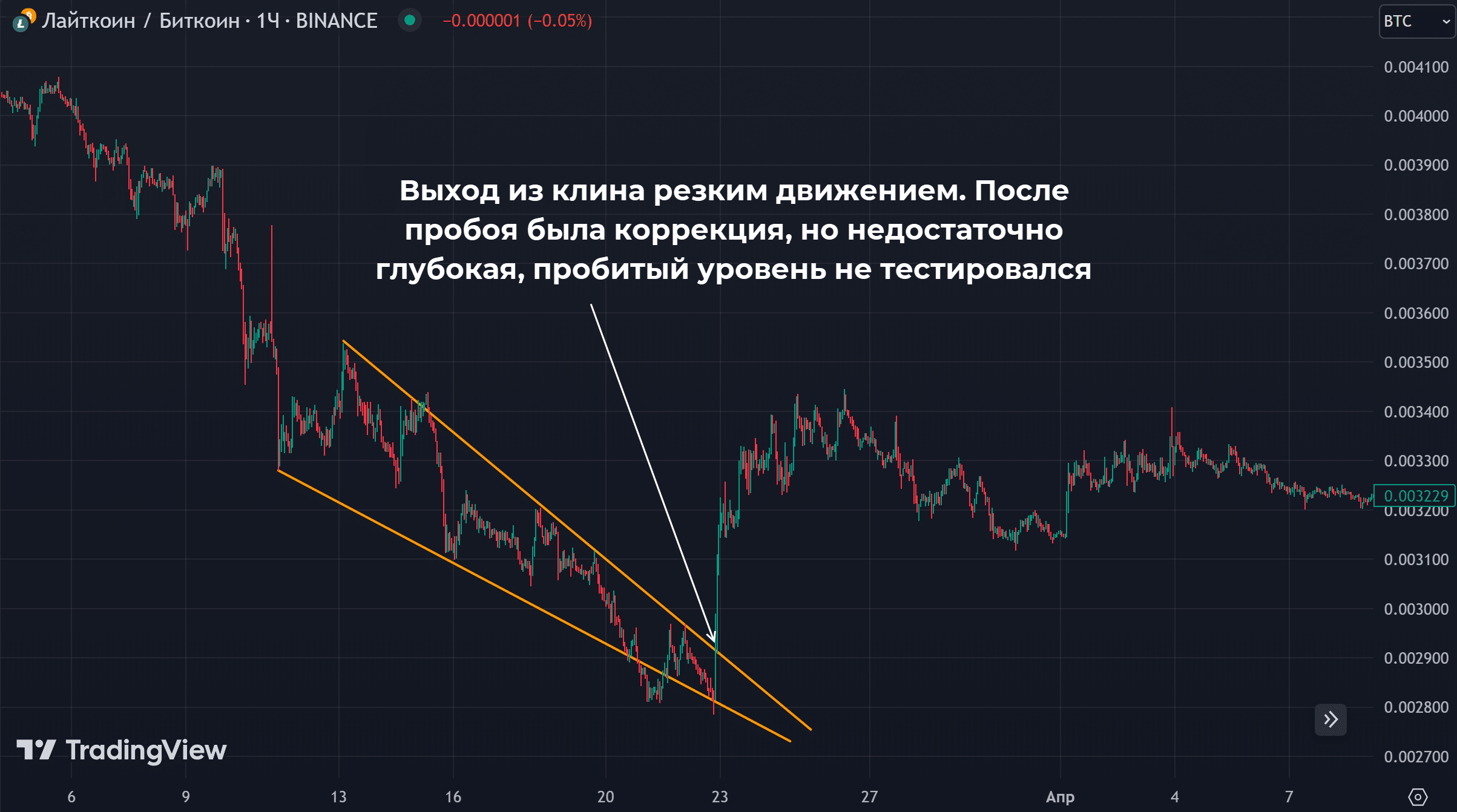 В отличие от обычного треугольника в случае с клином график почти доходит до точки пересечения линий. Еще одна особенность – крайне резкая отработка, из-за этого стандартная схема со входом в рынок при ретесте пробитого уровня может не сработать.