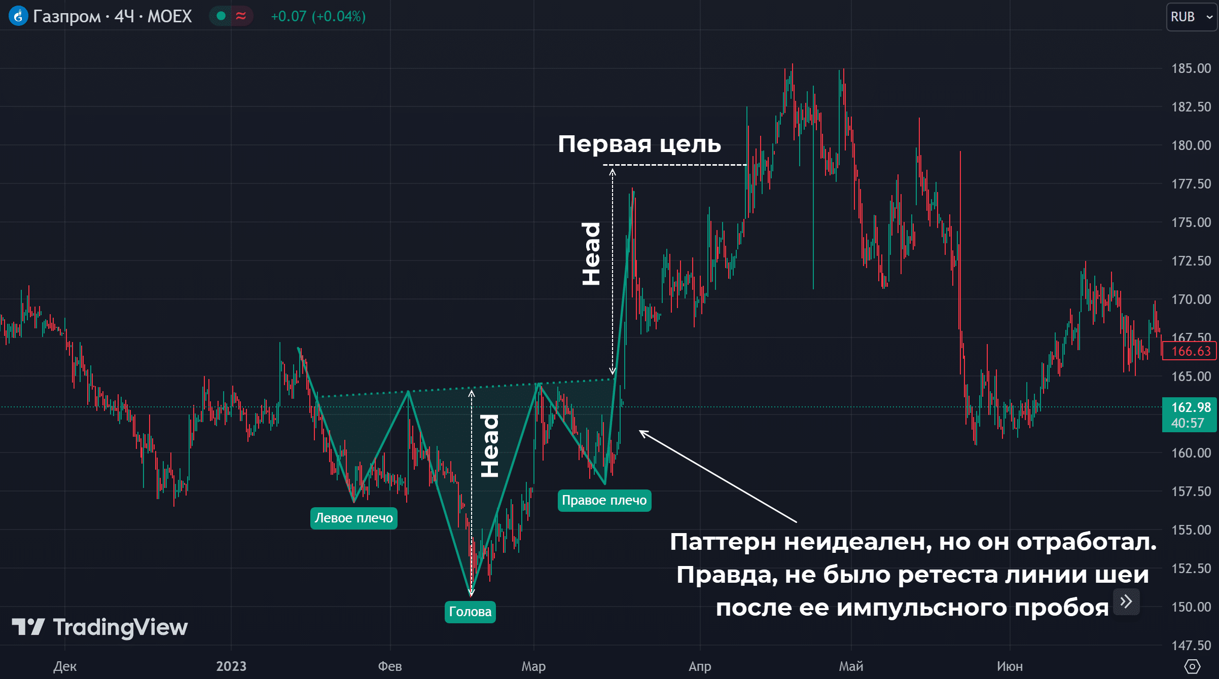 Сильнейший паттерн, выглядит как 3 минимума, средний из которых самый низкий. Основные элементы паттерна перевернутая голова и плечи:
