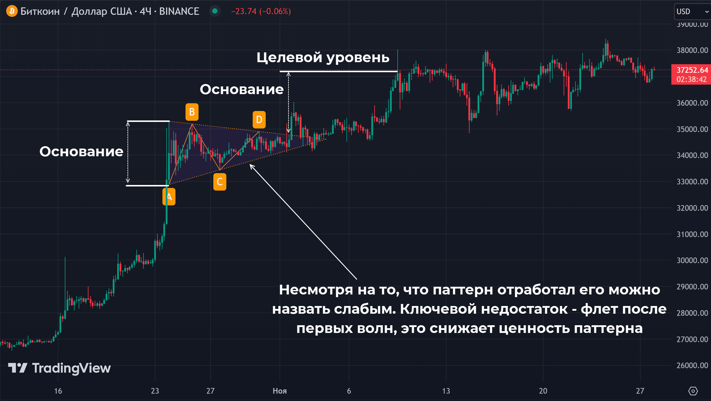 Но и идеальные паттерны могут не отрабатывать. Ниже именно такой пример, после практически вертикального движения получили флаг, но отработка оказалась слабой.
