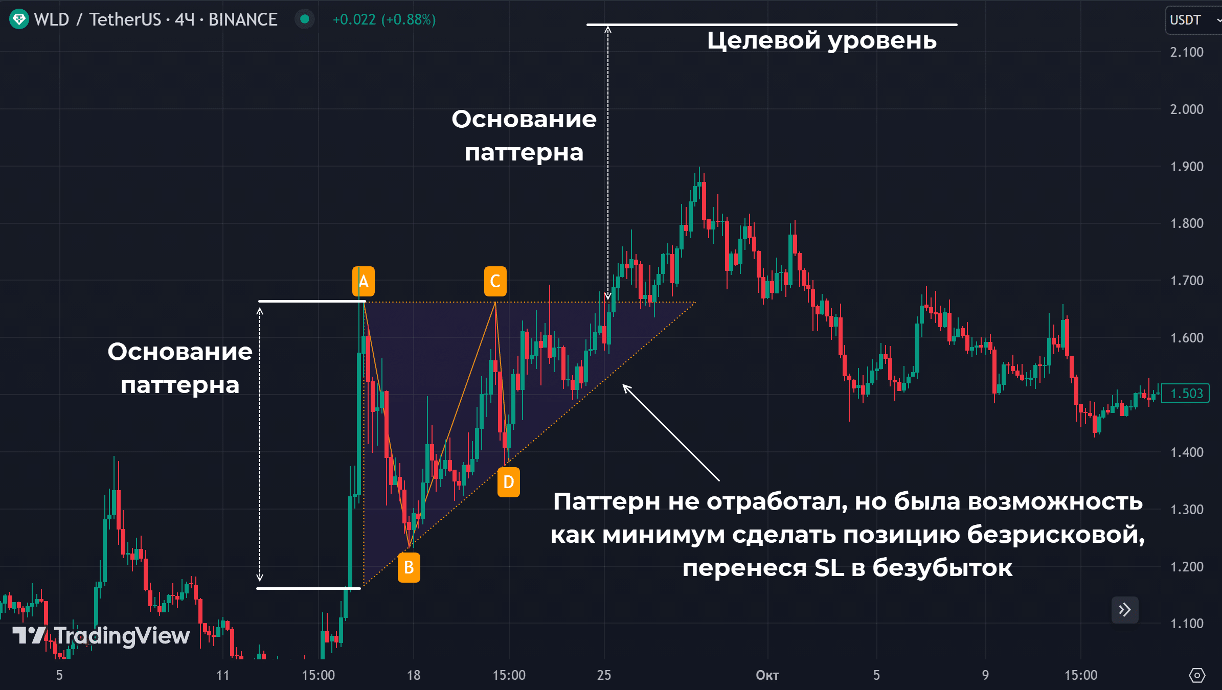 - После выхода за пределы фигуры вероятнее всего график пройдет расстояние, равное основанию треугольника. Здесь можно установить тейк-профит.