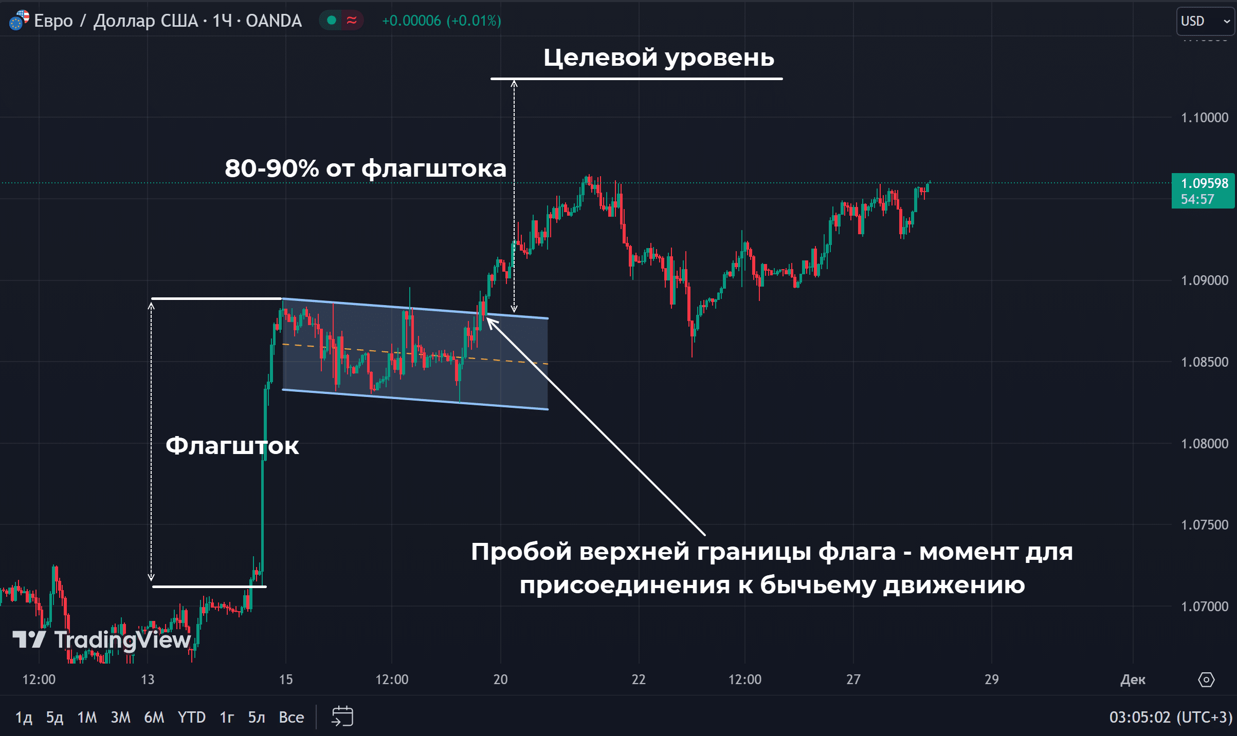 - После пробоя верхней границы канала (флага) начинается отработка паттерна. Положение целевого уровня можно рассчитать, отложив от точки пробоя расстояние, равное 80-90% от высоты флагштока. Цель несколько уменьшается, чтобы повысить вероятность достижения целевой зоны.