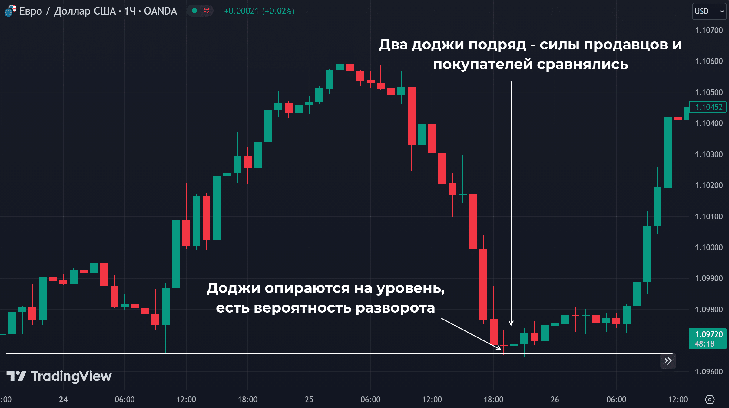- График подходит к уровню поддержки, здесь закрывается первая свеча.