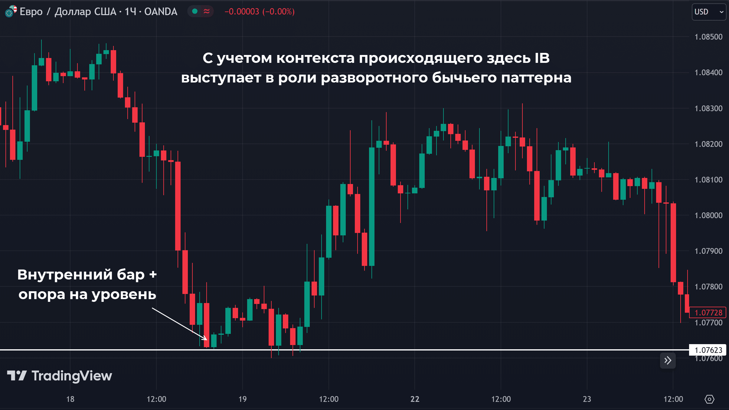 - Формируется внутренний бар. Эта конструкция еще не является признаком разворота, ее нужно рассматривать как остановку на уровне поддержки. Небольшой диапазон внутреннего бара указывает на то, что покупатели и продавцы взяли передышку.