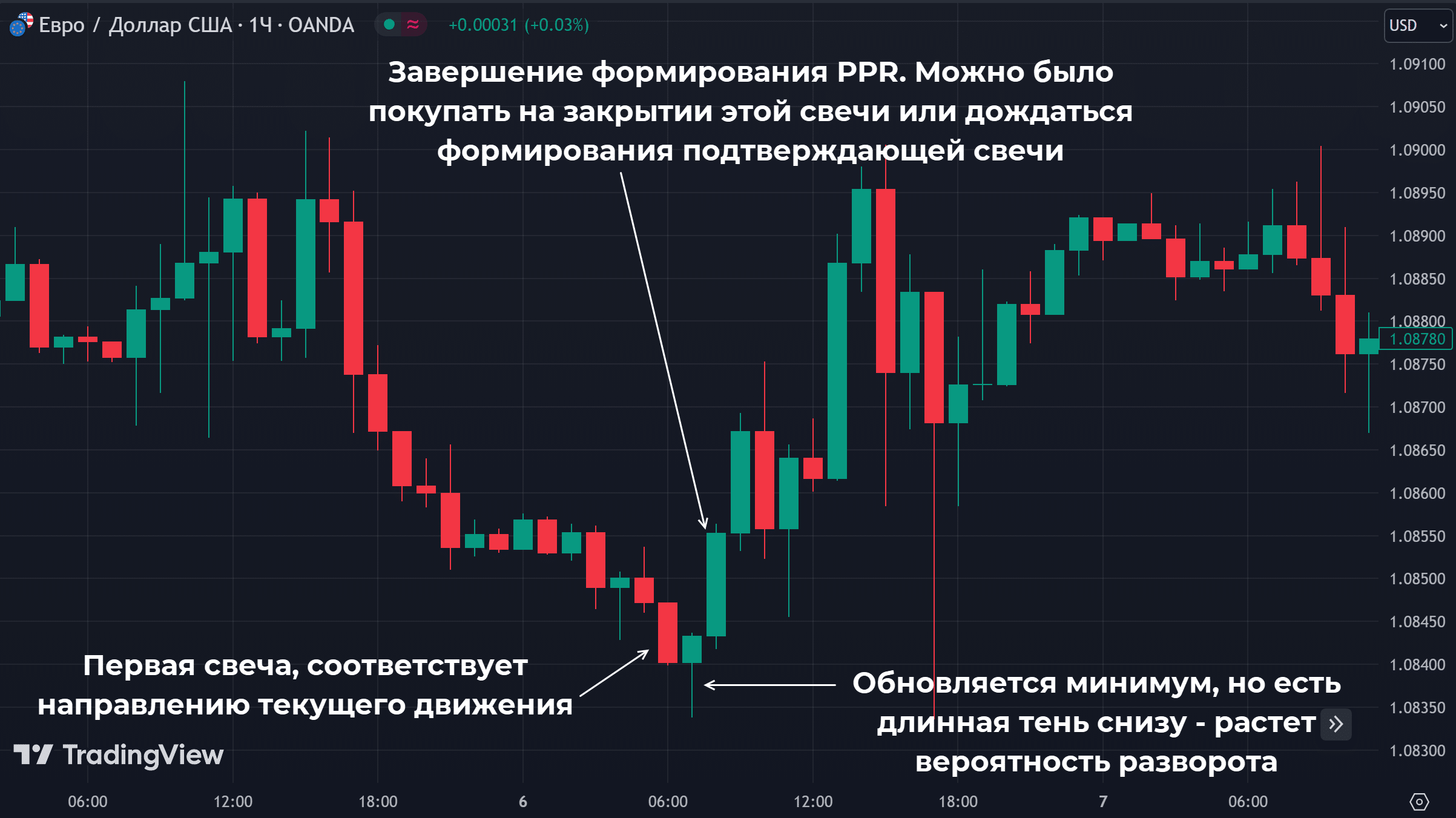 Внешне бычий PPR напоминает крюк, формирующийся на дне рынка. При умеренно-агрессивном сценарии можно открывать сделки на покупку уже на закрытии третьей свечки паттерна.