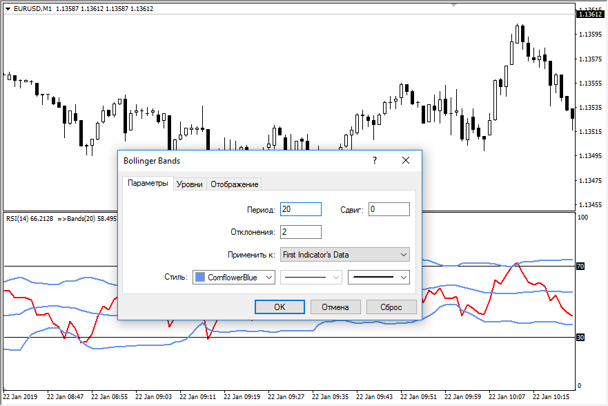 Подход необычен за счет того, что Bollinger Bands строятся не по графику, а по индикатору RSI. То есть в одном окне будут отображаться и линия RSI, и канал, образованный полосами Боллинджера. Чтобы добиться этого: