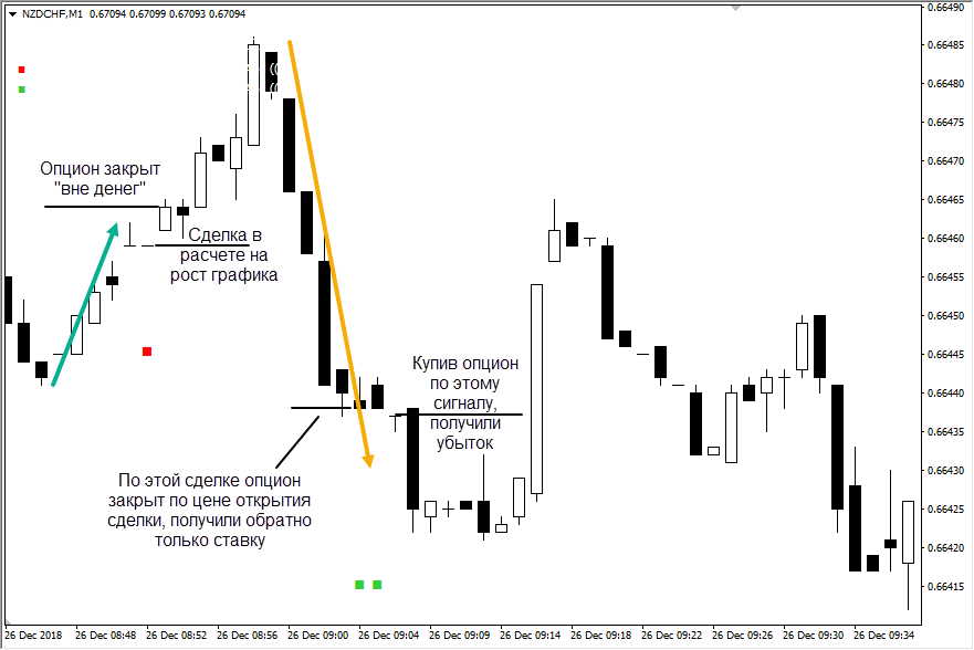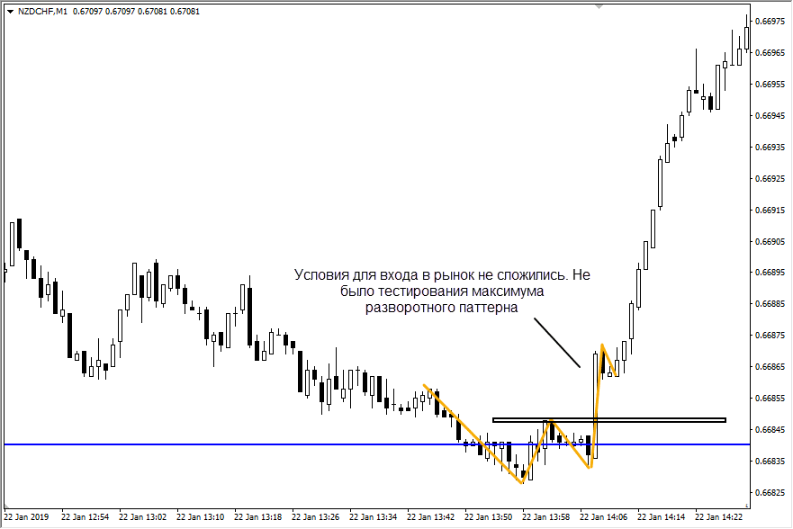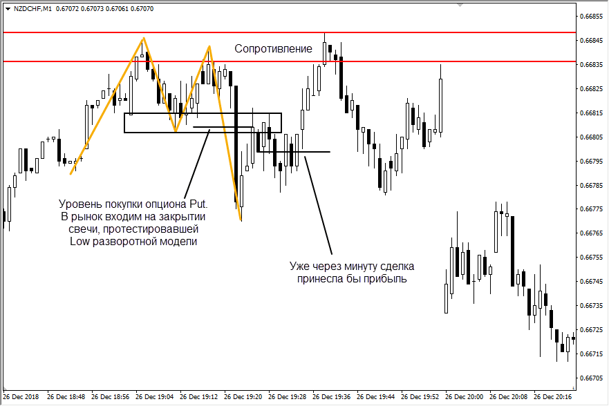 В примере выше состоялся уверенный отбой от поддержки, но оснований для покупок опциона Call не было. Не выполнен ретест локального максимума, сформированного на разворотном W-образном паттерне.