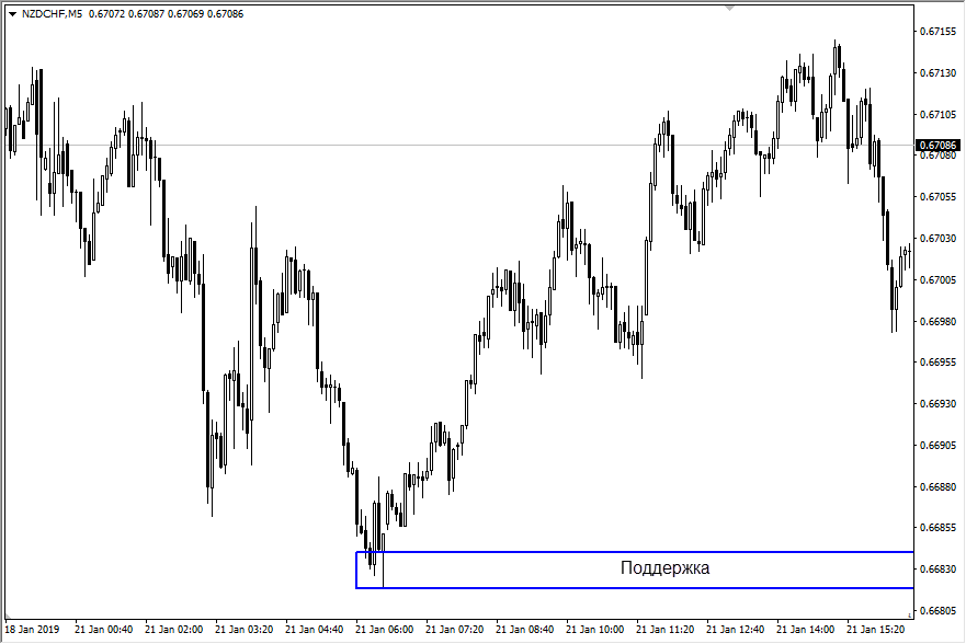 - Зоны поддержки/сопротивления, построенные на старшем таймфрейме. Старшим по отношению к М1 является М5-М15, выше подниматься нет смысла, слишком редкими будут сигналы. Зоны строим по теням свечей, соответствующих локальным экстремумам;