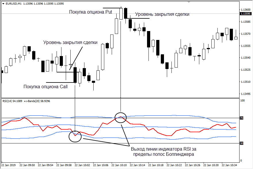 Торговля ведется в расчете на завершение импульсного движения и откат после него. Как только RSI пересекает верхнюю или нижнюю границу ВВ, по направлению из канала заключается сделка длительностью в 1-3 свечи. Длительность сделки придется подбирать в зависимости от торгуемой валютной пары.