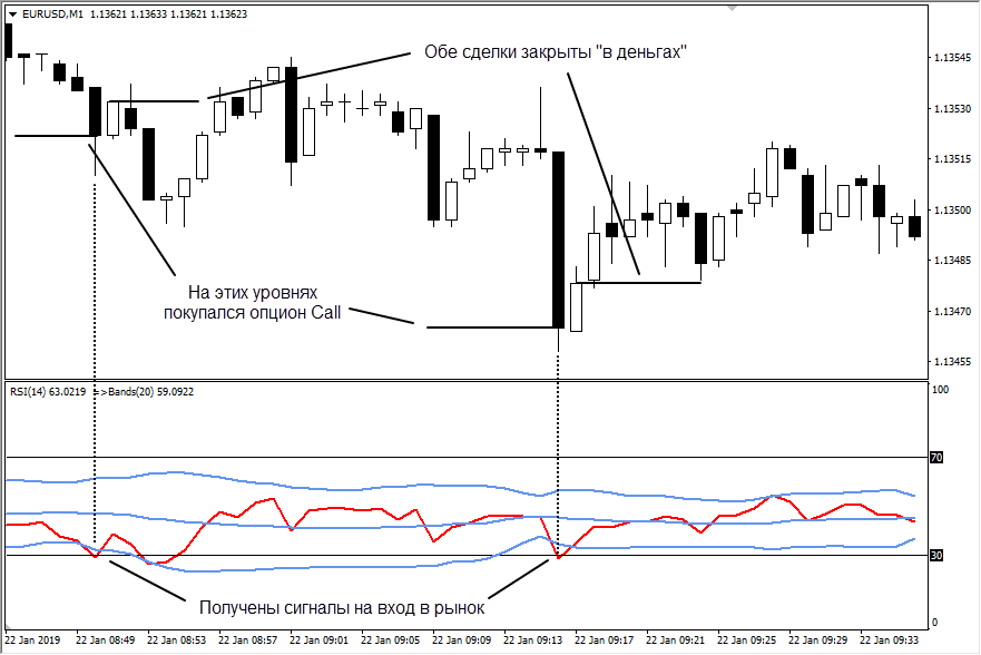Особенно хорошо такие сигналы отрабатывают после резких движений, когда свеча, на которой RSI вышел за ВВ в несколько раз превышает соседние свечи. В таких ситуациях идет откат на несколько пунктов, который и позволяет заработать на турбо опционах. Ниже – примеры сделок.