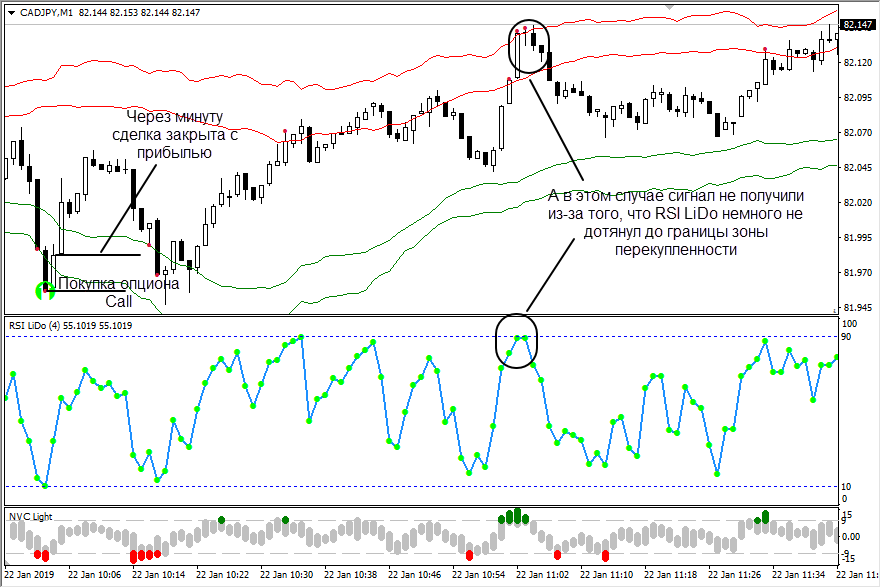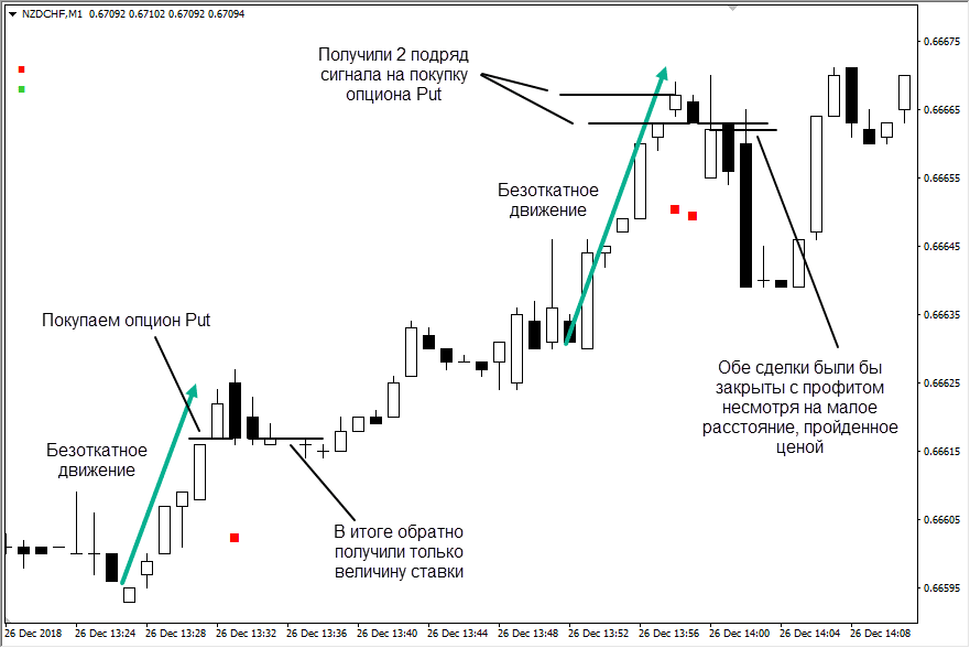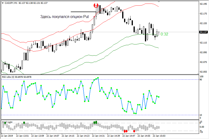 По этой стратегии торговли бинарниками попробуйте поэкспериментировать с экспирацией. Практика показывает, что не всегда 1 свечи хватает для отработки сигнала.