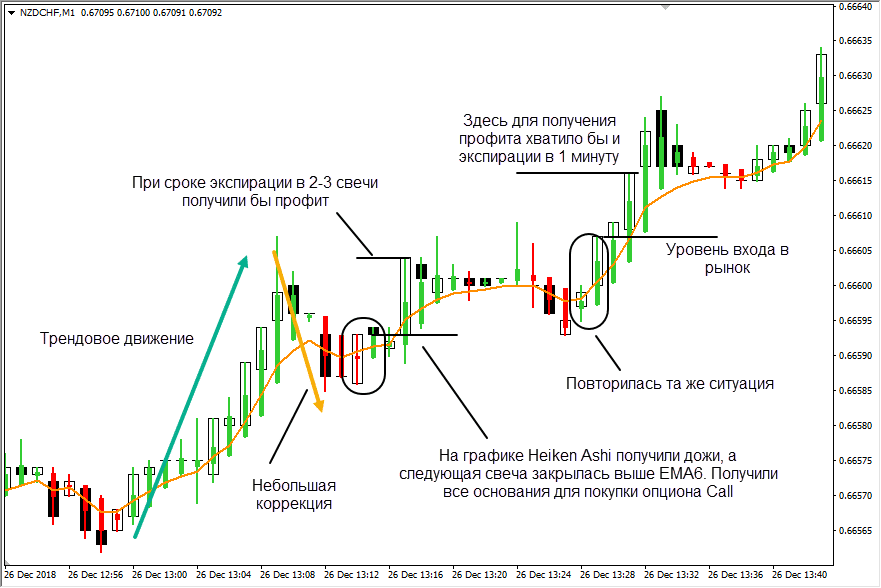 Помимо Heiken Ashi, на график добавьте скользящую среднюю ЕМА6.