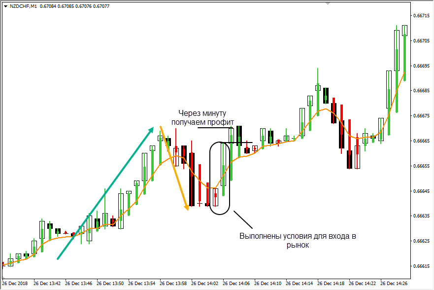 Особенно хорошо ТС работает во флете. На рисунке ниже – пример такой ситуации, серию из 4 прибыльных сделок можно было заключить чуть больше чем за час.