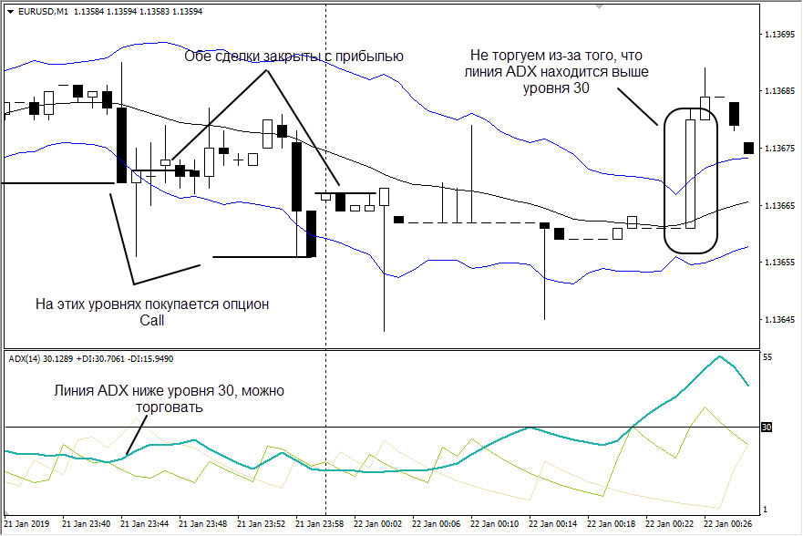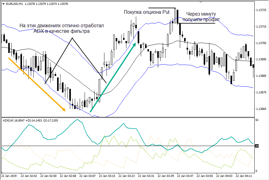 - ADX с периодом 14. В нем понадобится только главная линия, а на линии ±DI внимание не обращайте.
