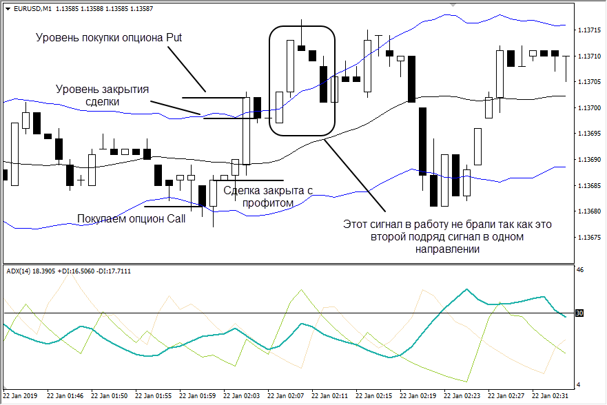 - Больше одного сигнала в одном направлении пот данной стратегии не берем. Если отработал, например, отбой от верхней границы, то график должен дойти до нижней границы. Только после этого снова можно рассматривать сделки с опционами Put на 1 минуту.