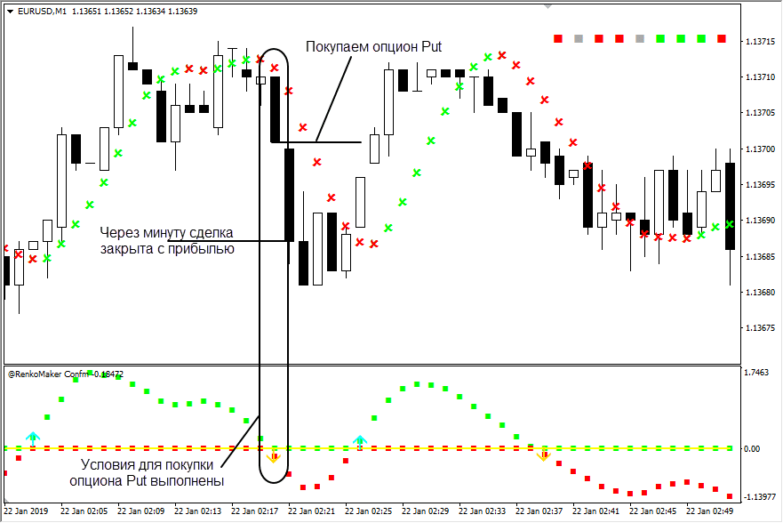 Стратегии для бинарных опционов на 60 секунд создаются такими, чтобы минимизировать время на анализ рынка. Потому сигналы по ним предельно ясны, и трейдеру не приходится терять время на чтение индикаторов. Следующая ТС в нашей подборке построена на наборе пользовательских индикаторов, используются алгоритмы RenkoMaker, MTF и Signal. Понадобится и вспомогательный советник RenkoLiveChart.
