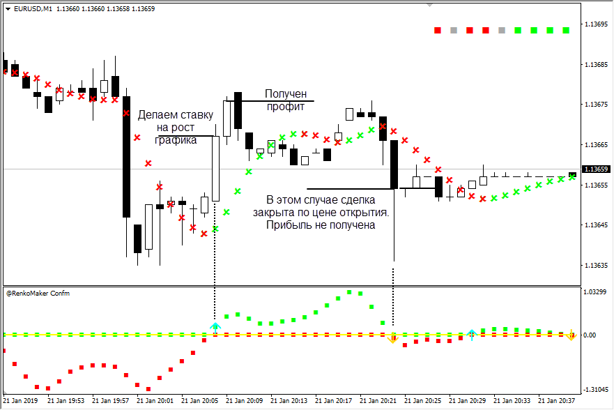 - В окне RenkoMaker пунктирная линия пересекает нулевую линию, и появляется стрелка, подтверждающая выполнение условий для входа в рынок;