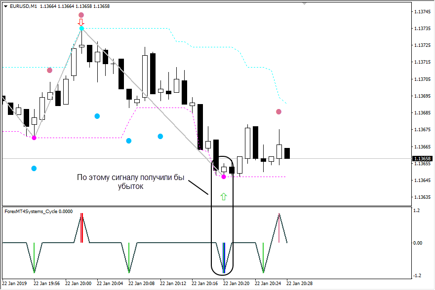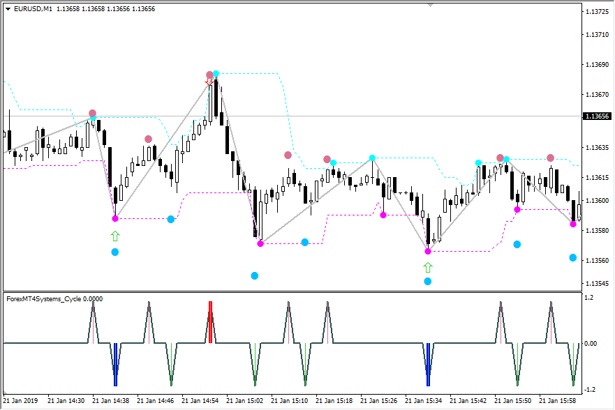 Для торговли достаточно иметь стрелку на зигзаге и подтверждение на ForexMT4SystemsCycle. Если сигнал истинный, то в «подвале» на индикаторе увидите утолщенный столбец. Длительность сделок в пределах 1-5 свечей.