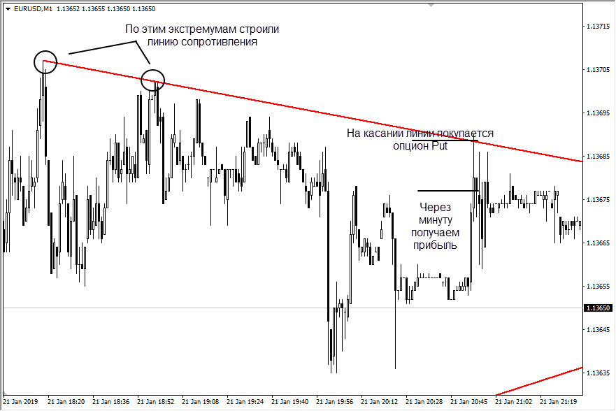 В рынок входим на касании графиком построенной линии, причем только на третьем касании. Последующие подходы к поддержке, сопротивлению в работу не берутся. Так как наша цель – отскок, то экспирацию выставляйте в 60 секунд — 2 минуты.