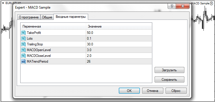 Нажав на робота, переходим к параметрам и его настройке. Окошко во многом напоминает настройку индикатора: