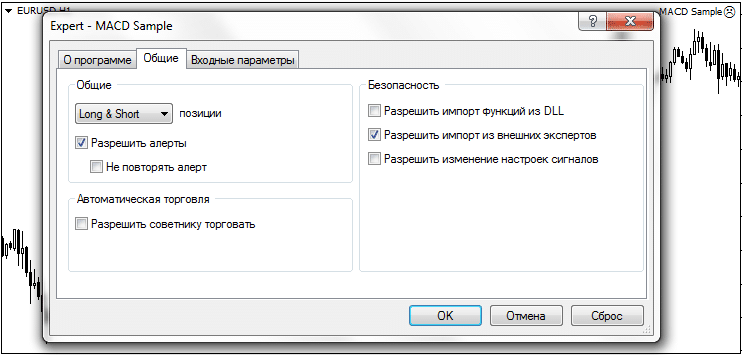 - Ставим галочку, разрешающую советнику торговать, без этого он работать не будет.