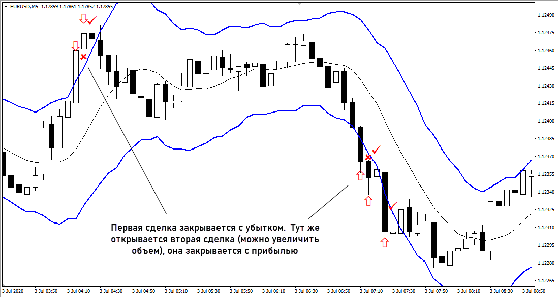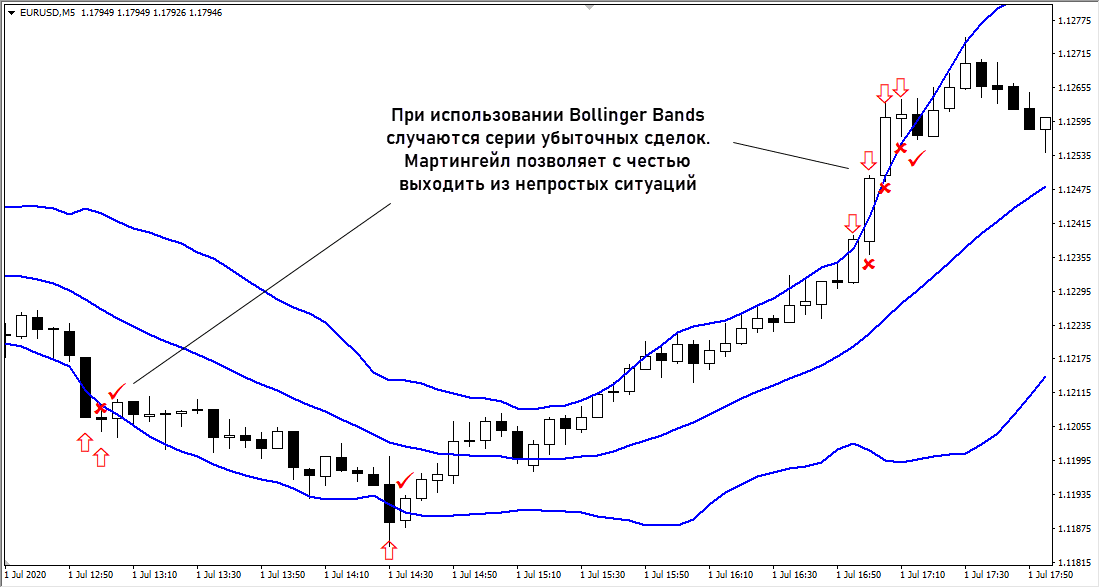 Сделки заключаются в расчете на откат после выхода за границы полос Боллинджера. Здесь также работает осторожный мартингейл.
