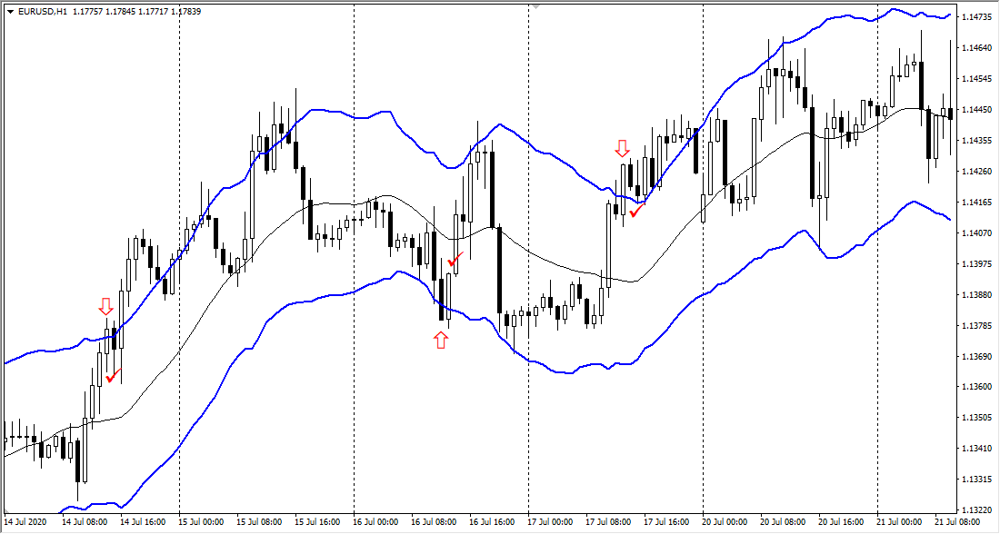По сравнению с Bollinger Bands получившийся диапазон не так остро реагирует на движения графика. Принцип работы с диапазоном стандартный: