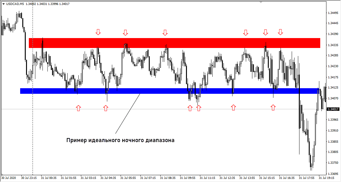 Ночь – идеальное время для работы на отбой от границ диапазона. Если выбирать валютные пары, не содержащие японскую иену, австралийский и новозеландский доллары, то вероятность резких движений невысока.