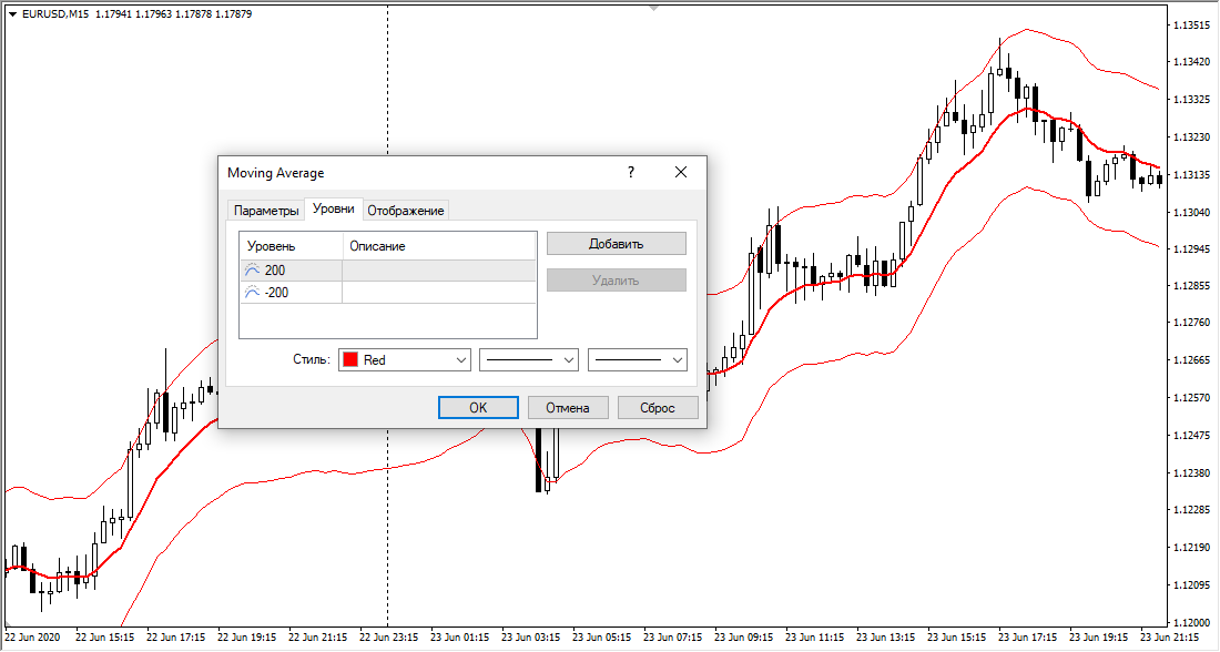 Для построения диапазона в настройках Moving Average во вкладке «Уровни» нужно указать положение уровней. Число означает смещение по вертикали вверх и вниз (знак «-» указывает на смещение вниз). Учитывайте разрядность котировок, в примере ниже мувинг смещен на 20 пунктов, но у брокера точность котировок составляет 5 знаков после запятой, поэтому настройках указаны числа 200 и -200.