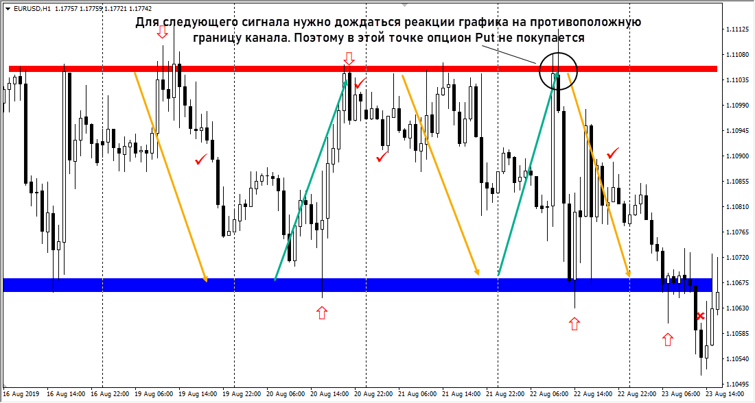 Выше показан идеальный сценарий работы в горизонтальном канале. Диапазон движения широкий, волатильность неплохая, поэтому брокер бинарных опционов не снижает выплаты. При реакции графика на границы коридора получаем целую серию прибыльных сделок.
