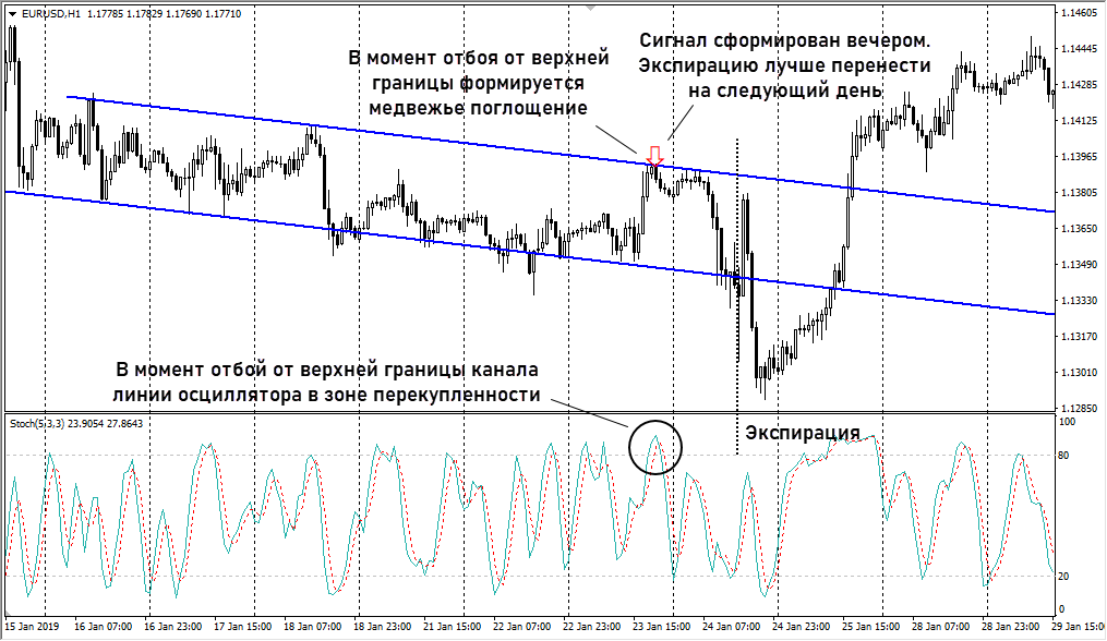 Фильтровать сигналы можно как свечными паттернами, так и индикаторами, можно комбинировать эти инструменты. Например, на нисходящем тренде график подходит к верхней границе канала, происходит ее касание, выход за пределы канала и возврат в него. Одновременно с этим формируется разворотная свеча и, например, на Стохастике обе линии находятся в зоне перекупленности.