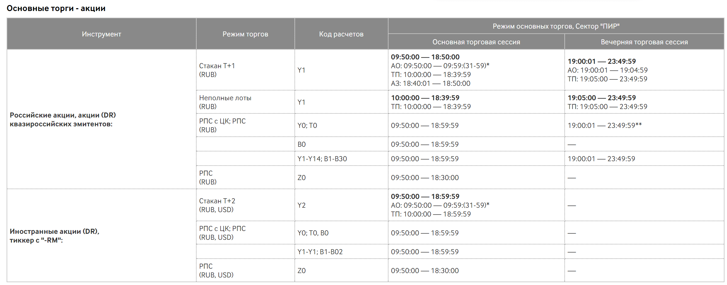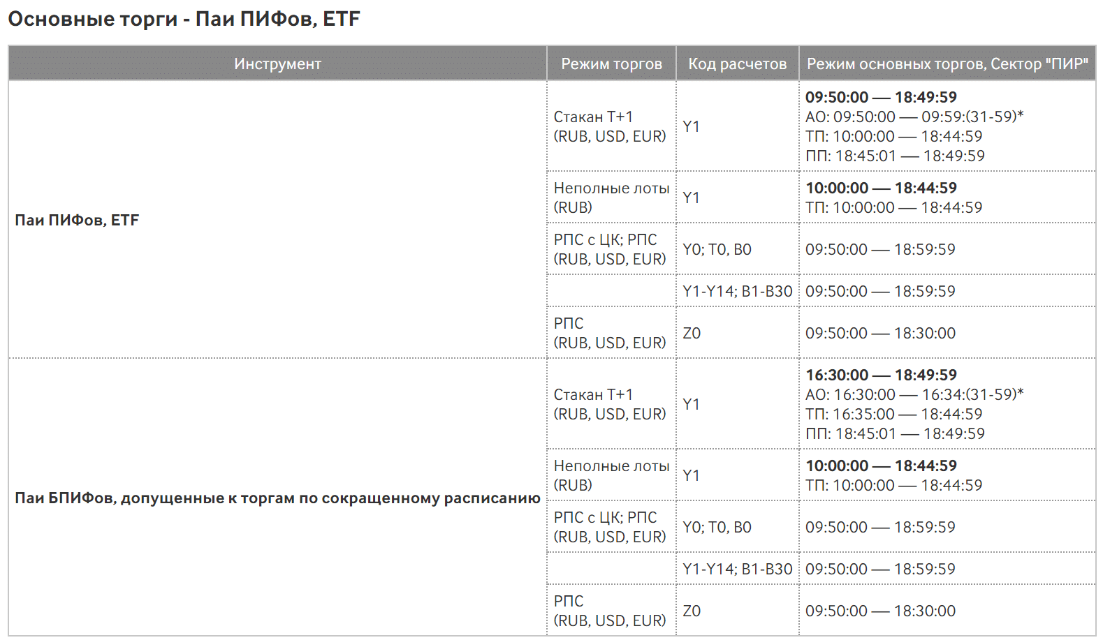 Для паев ПИФов и акций биржевых фондов условия несколько отличаются. Помимо аукциона открытия вводится понятие послеторгового периода (ПП в расписании ниже), разнятся и сроки их проведения.