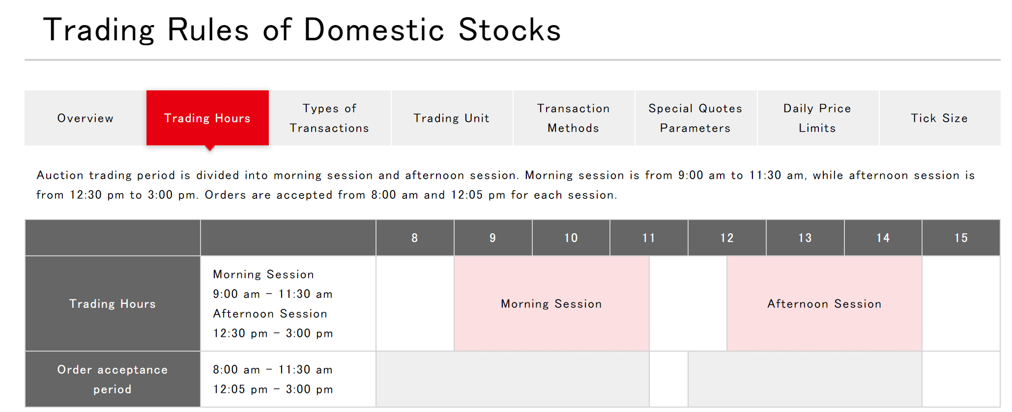 На токийской бирже свой график. В течение дня на главной японской площадке выделяют 2 сессии – утреннюю и послеобеденную, перед каждой из них есть аукцион открытия. Премаркет идет с 08:00 до 09:00 и с 12:00 до 12:30 по местному времени.