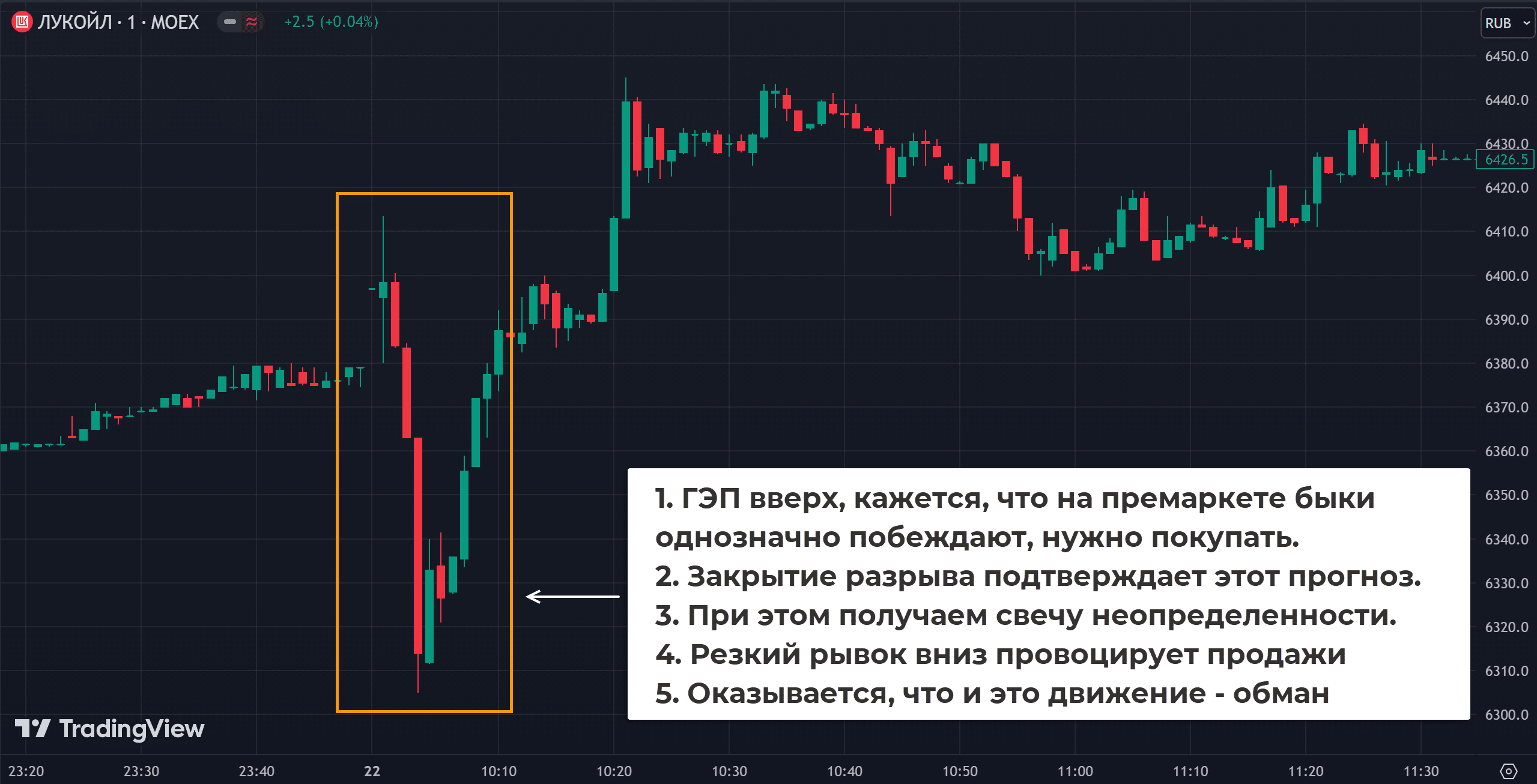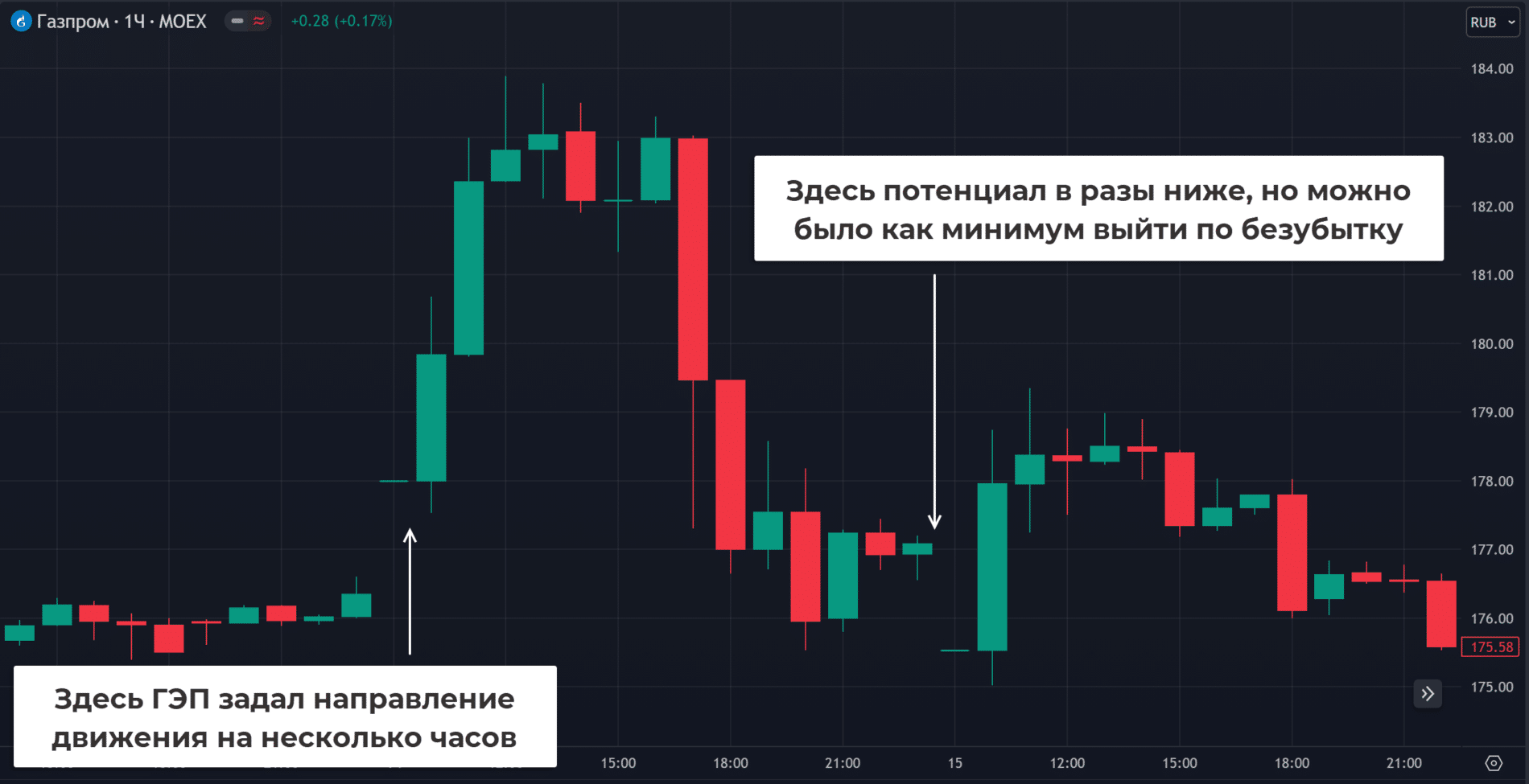 Если этот подход в целом не срабатывает, то чаще всего есть возможность выйти из рынка по безубытку. Редко сразу после ГЭПа начинается движение в противоположном направлении.