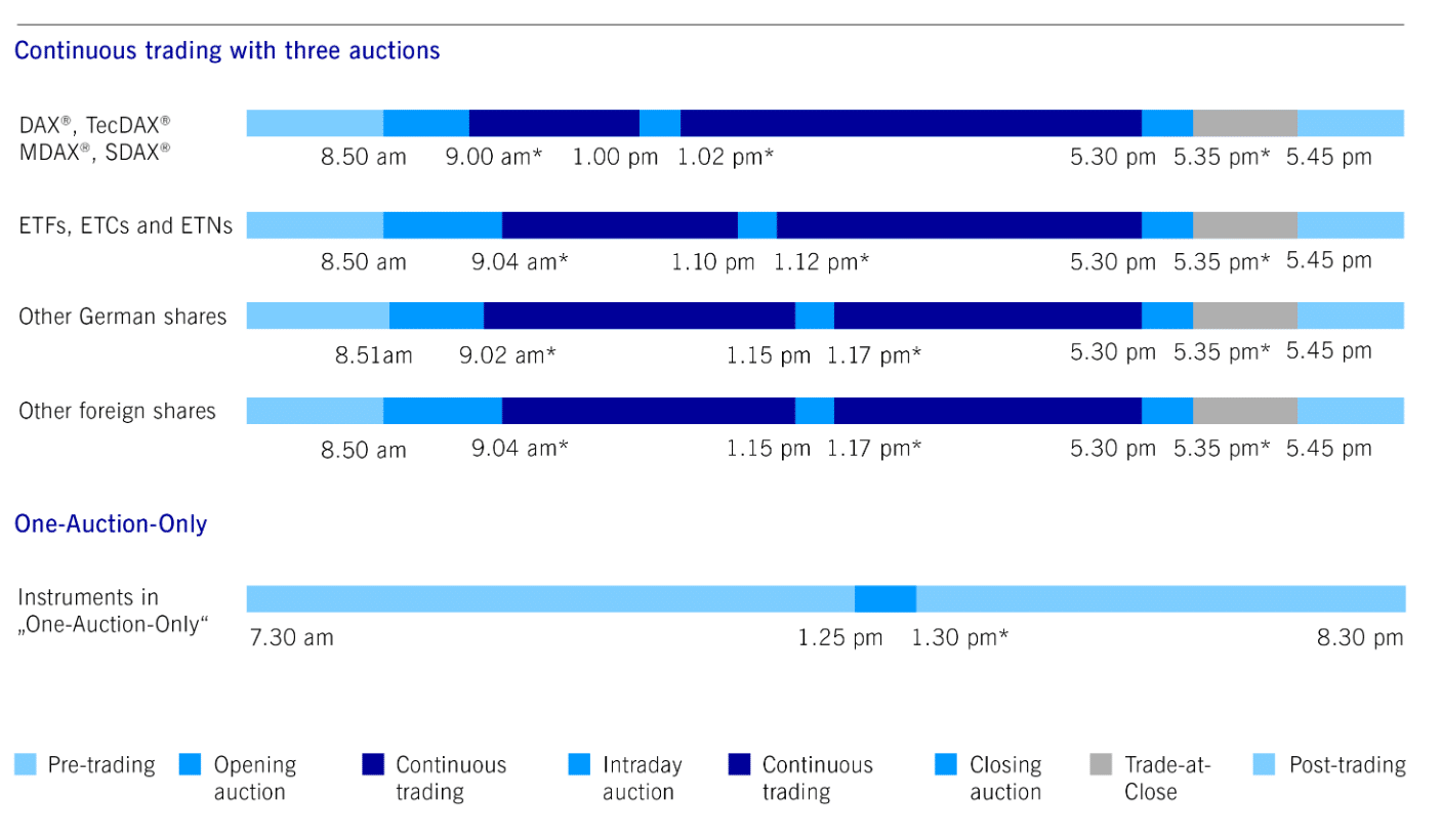 На Xetra используется модель непрерывной торговли, но и здесь есть фазы пре- и постмаркета. На примере немецких акций, входящих в состав DAX, MDAX, SDAX, TecDAX, используется местное время: