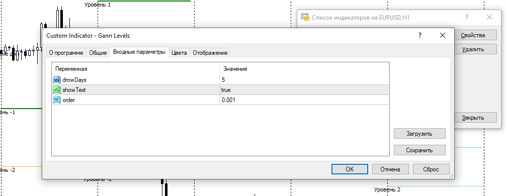 - order – этот параметр влияет на расстояние между горизонтальными линиями. Значение по умолчанию – 0,001, при его уменьшении уровни сужаются, при увеличении – расширяются.