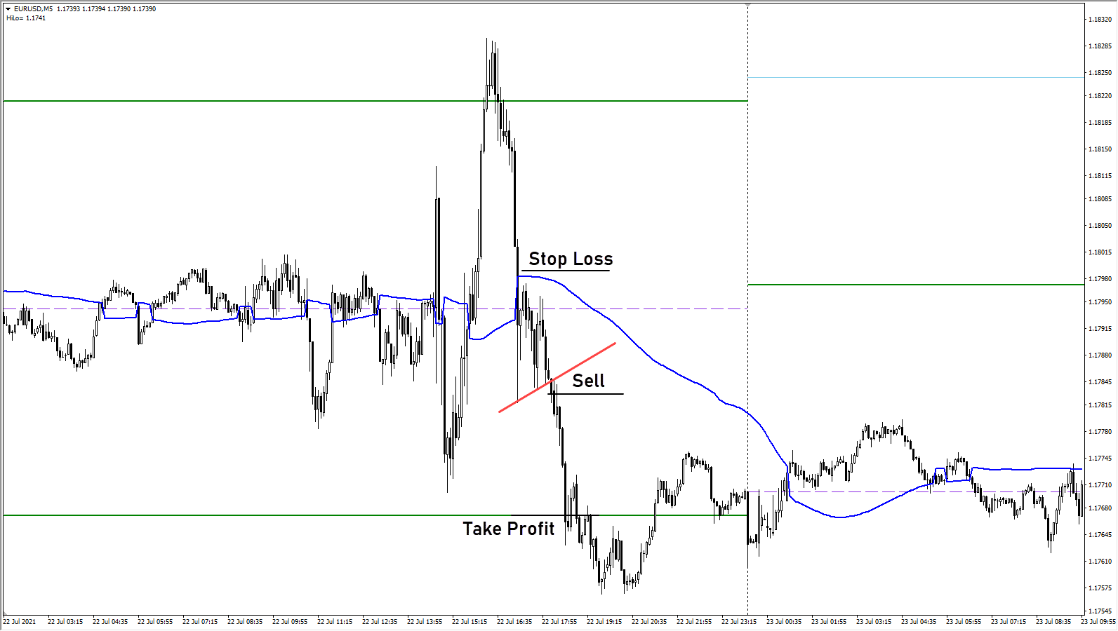 Принципиальное отличие от мувинга заключается в более резкой реакции при переходе графика через линию индикатора. Если МА реагируют плавно, то Gann Hilo совершает резкий рывок.