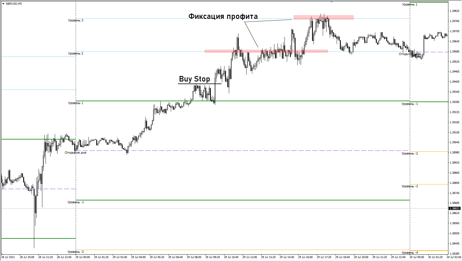 Точки входа формируются на обновлении пробойного экстремума. Работать можно и отложенным ордером и по рынку. Более агрессивный вариант входа – заключать сделки в момент тестирования пробитого уровня. Фиксация прибыли производится на следующих уровнях Ганна.