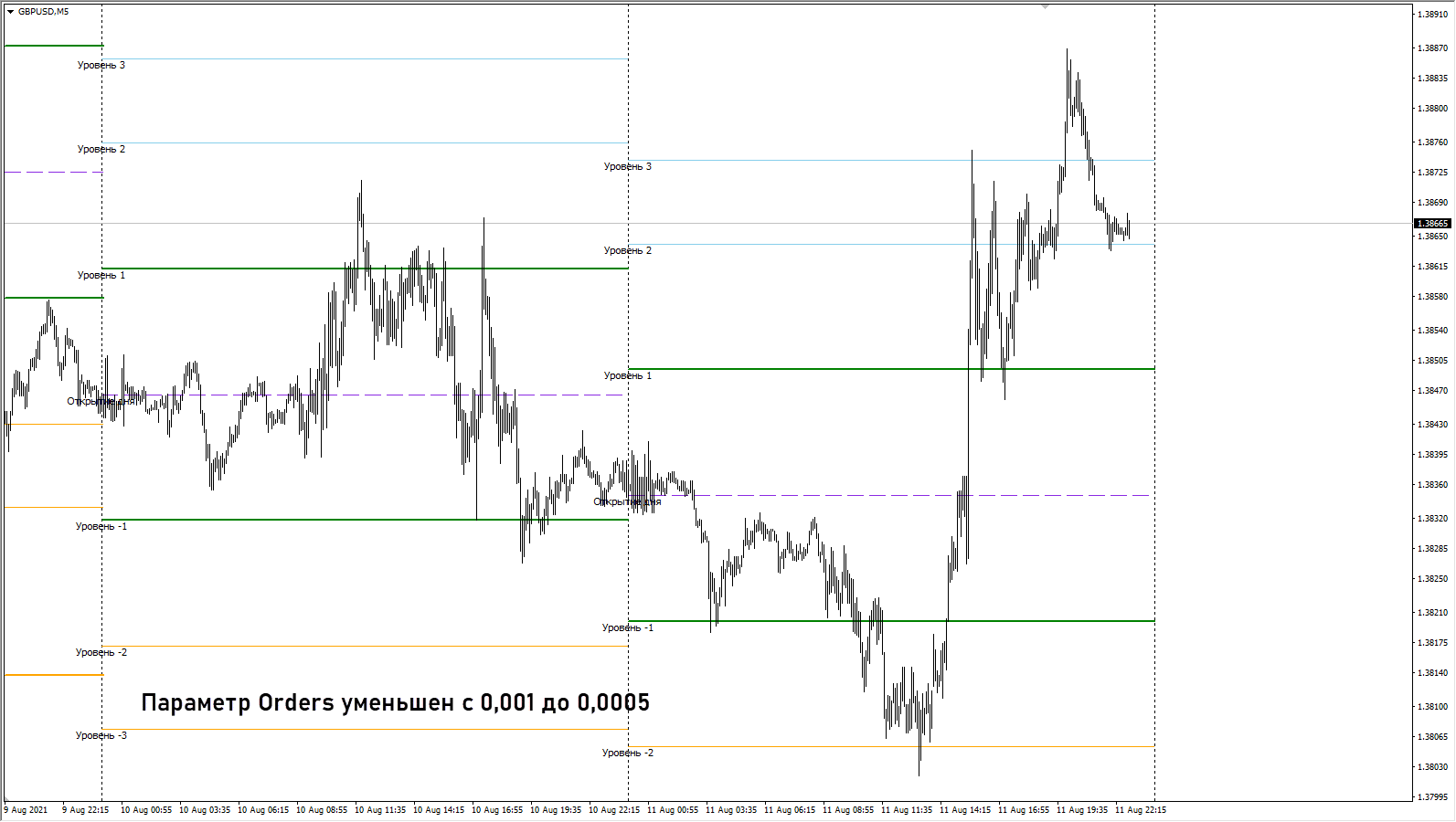 При уменьшении параметров Order можно добиться того, что при средней дневной волатильности график будет регулярно тестировать несколько уровней в течение дня. При таком сценарии понадобится более жесткая фильтрация отбойных/пробойных сигналов при реакции на Gann Levels.