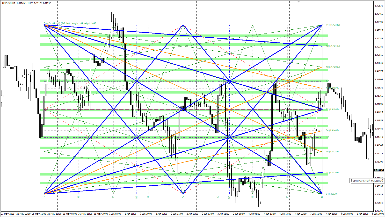 Выше показаны уровни для квадрата 144 х 144, по той же логике можно выполнять разметку для других размеров Gann square. Построения выполнены по пересечениям основных линий (синего и оранжевого цвета), остальные вспомогательные линии самого индикатора, строящего квадрат, в определении положения уровней они не задействованы.