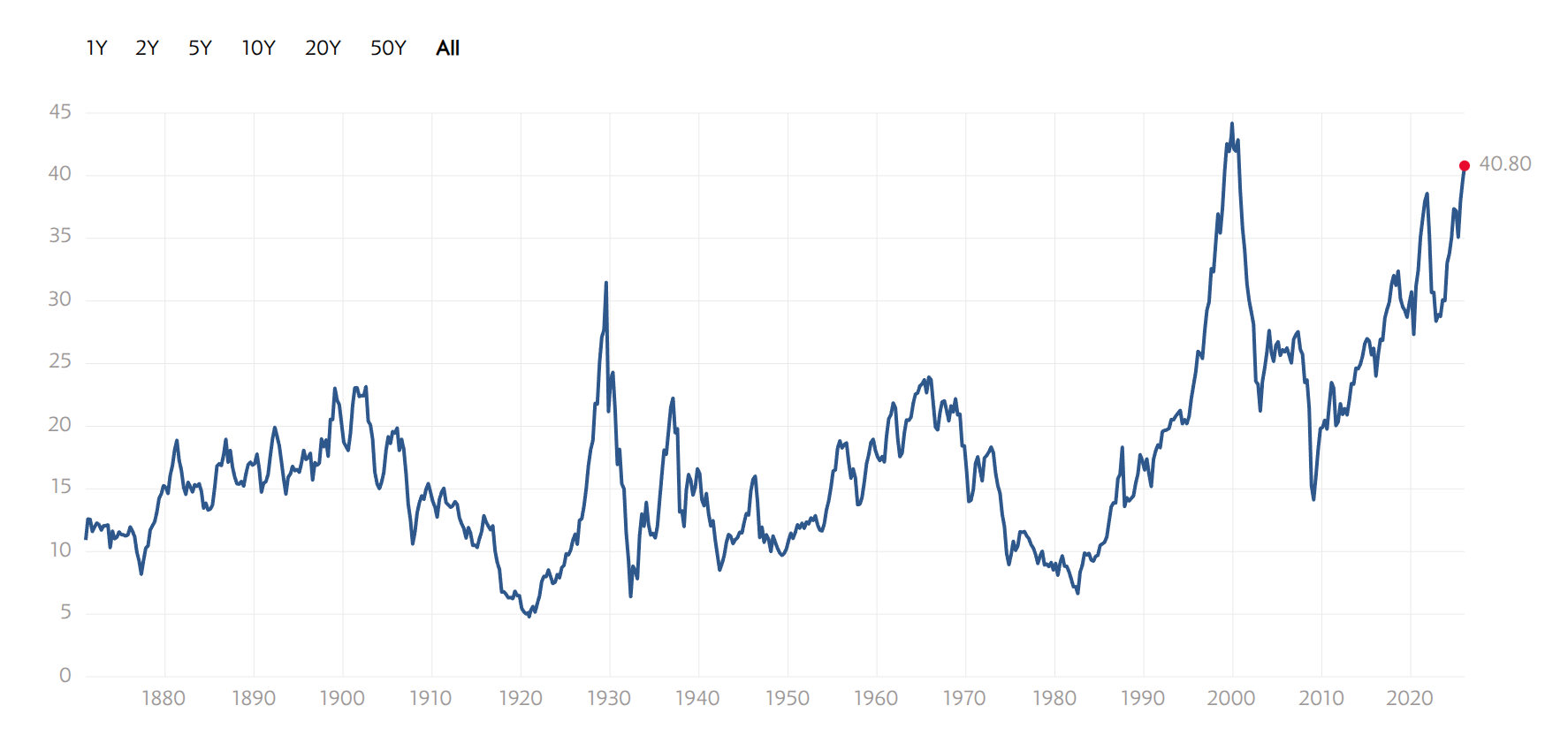 По данным GuruFocus на 1 января 2026 года, CAPE индекса S&P 500 составляет 40,32. Для сравнения: историческая медиана этого показателя — около 16–17. Текущее значение находится в верхних 10% всех наблюдений с 1988 года и сопоставимо с пиками перед крахом доткомов в 2000 году.