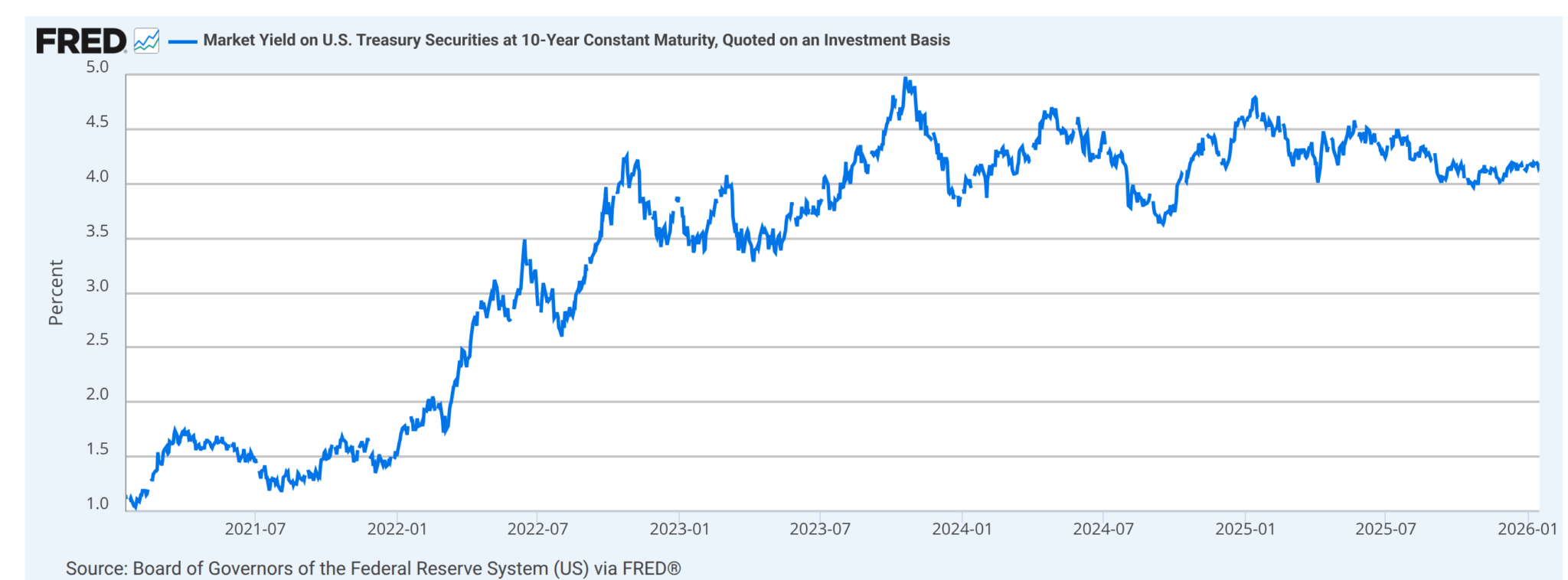 Параллельно с ростом оценок акций произошла фундаментальная трансформация на рынке облигаций. Доходность 10-летних казначейских облигаций США в январе 2026 года колеблется в диапазоне 4,16–4,23% — это четырёхмесячные максимумы и уровни, которые ещё несколько лет назад казались недостижимыми.